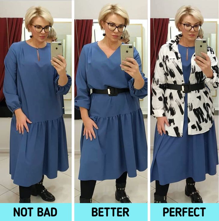 - Το μπλε φόρεμα στην παραπάνω εικόνα φαίνεται φαρδύ. Στην πραγματικότητα δεν είναι κακό, αλλά θα φαίνεται καλύτερο αν τονίσετε τη μέση με τη βοήθεια μιας ζώνης. Έκανε την εμφάνισή μου πιο ολοκληρωμένη και βελτίωσε όλα τα δυνατά μου σημεία παρά το γεγονός ότι το φόρεμα είναι κλειστό. Στη σωστή εικόνα, δημιούργησα μια κάθετη γραμμή με τη βοήθεια ενός ξεκούμπωτου πουκάμισου.