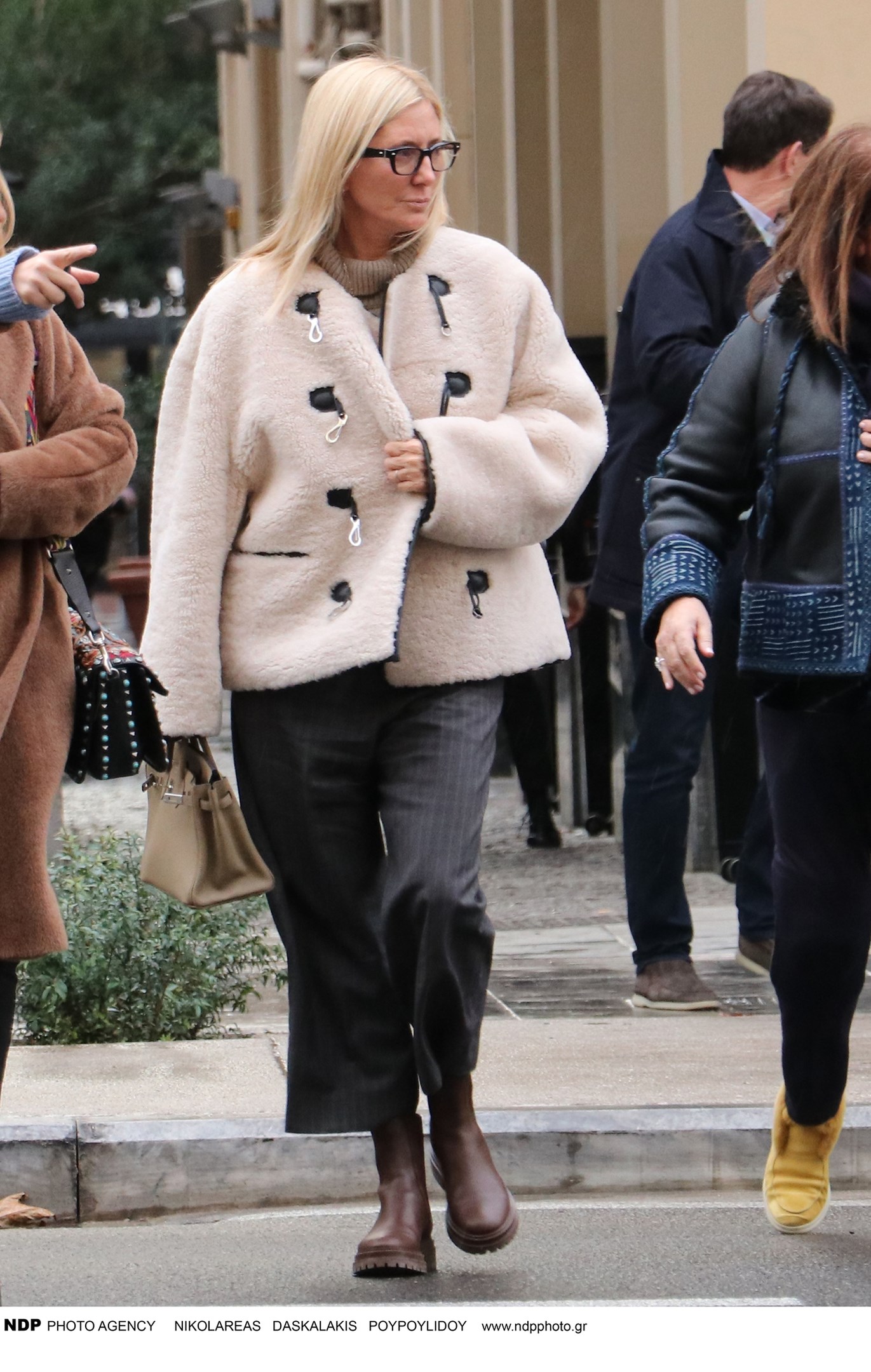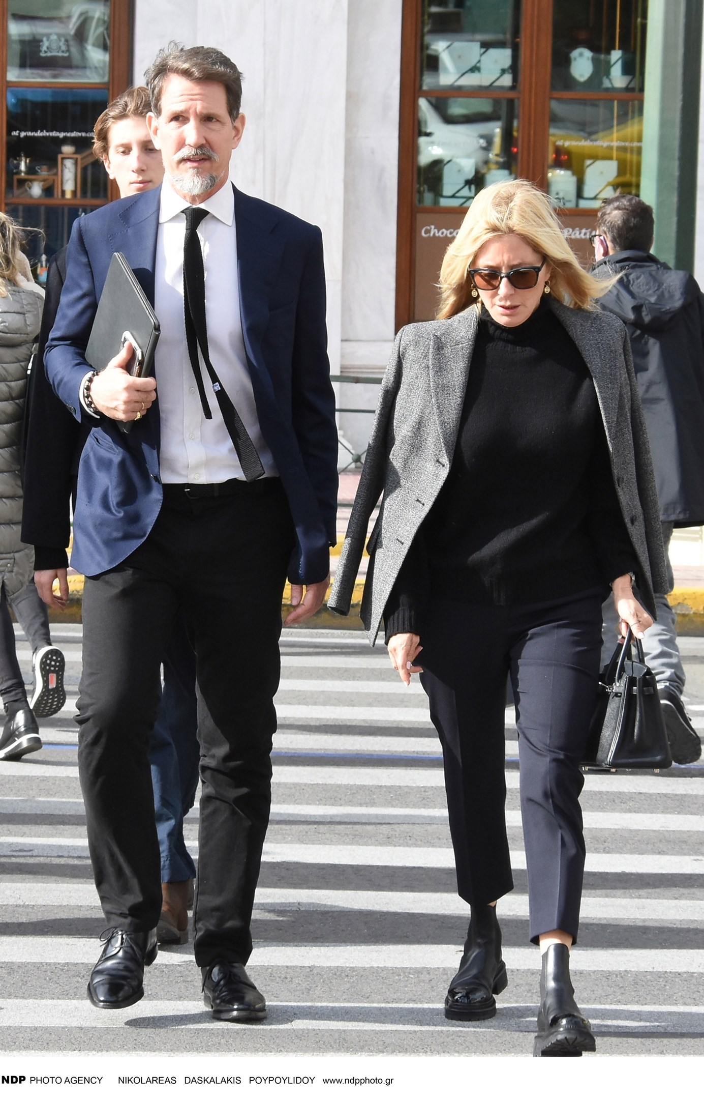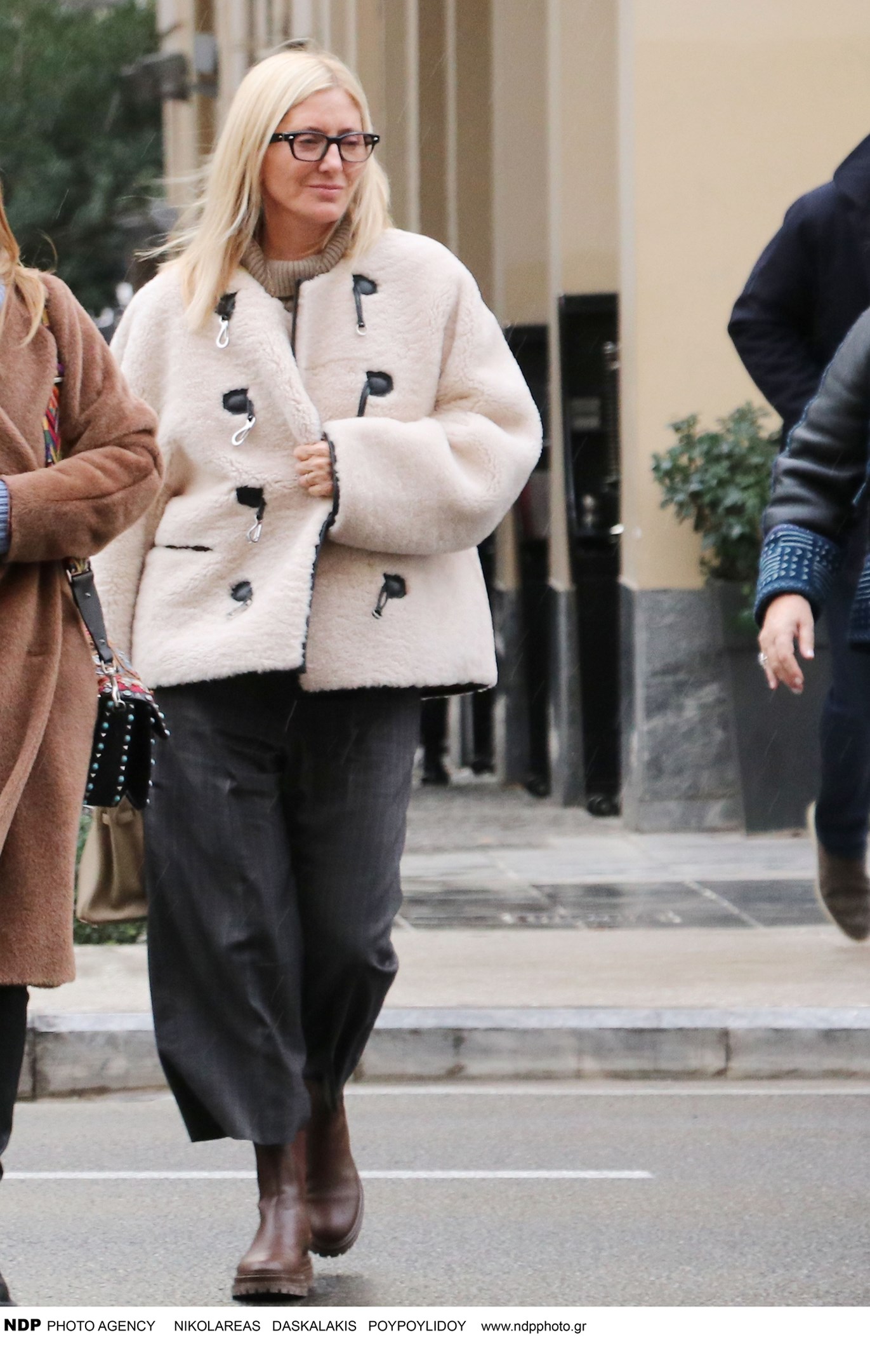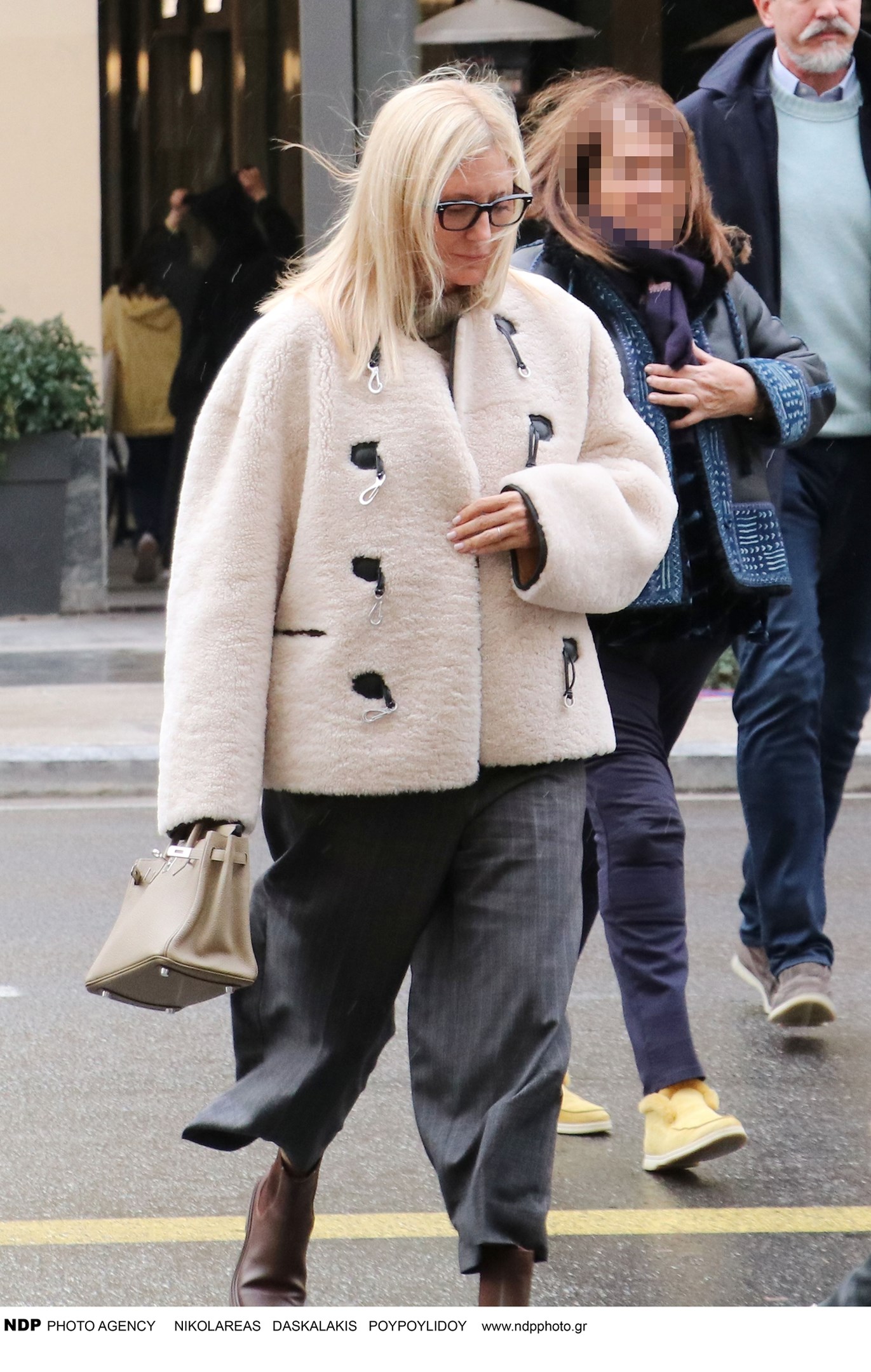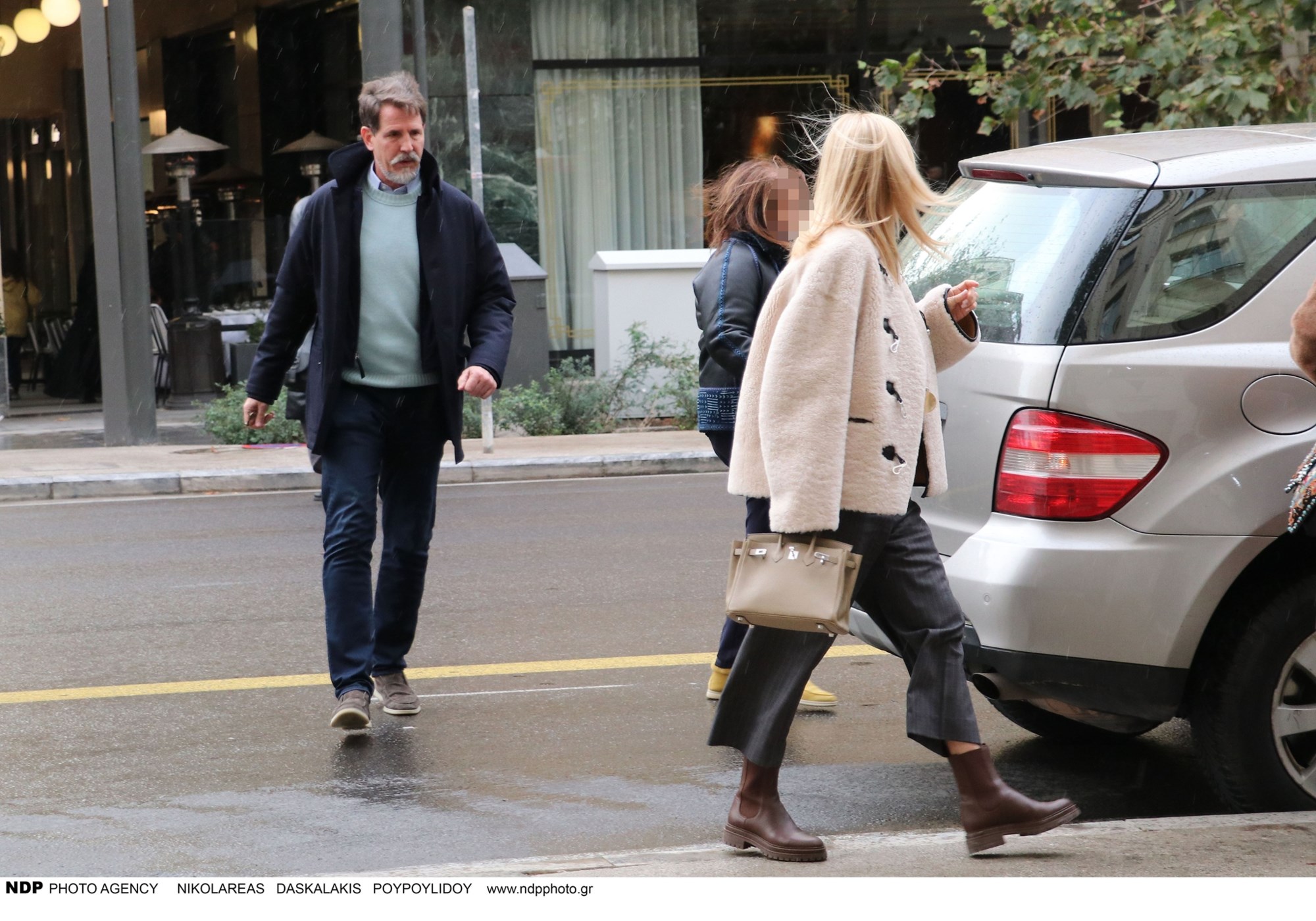Εκείνη την ημέρα είχε κρύο και χιονόνερο και οι δυο τους ντύθηκαν πολύ ζεστά. Η Μαρί Σαντάλ φόρεσε ένα cropped παντελόνι και ένα off white μπουκλέ πανωφόρι.