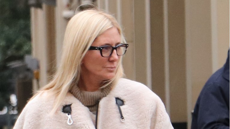 Η Μαρί Σαντάλ ήταν κομψή με ψηλόμεσο τζιν παντελόνι, μπεζ πουλόβερ και τσάντα σε σκούρο μπεζ.