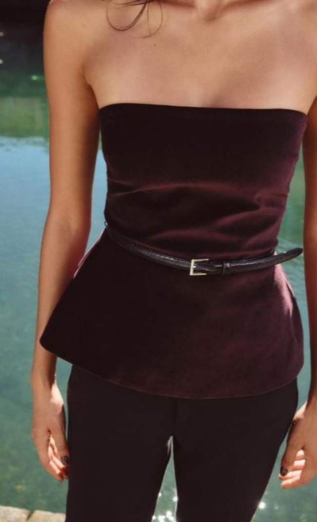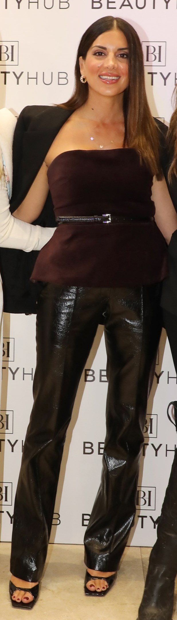 Η παρουσιάστρια επέλεξε ένα εντυπωσιακό outfit, με κύριο κομμάτι ένα βινύλ παντελόνι, το οποίο συνδύασε άψογα με ένα βελούδινο στράπλες τοπ από την αλυσίδα καταστημάτων Zara. Το μεσάτο τοπ, το οποίο περιλαμβάνει μια κομψή, λεπτή ζώνη στη μέση, ανήκει στη νέα συλλογή Zara και διατίθεται στην τιμή των 25,95 ευρώ.