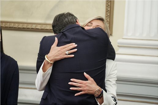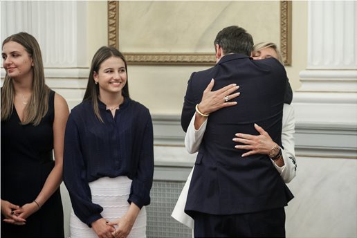 Στο τέλος της τελετής ο νέος Πρωθυπουργός Κυριάκος Μητσοτάκης αγκάλιασε όλα τα μέλη της οικογένειάς του.