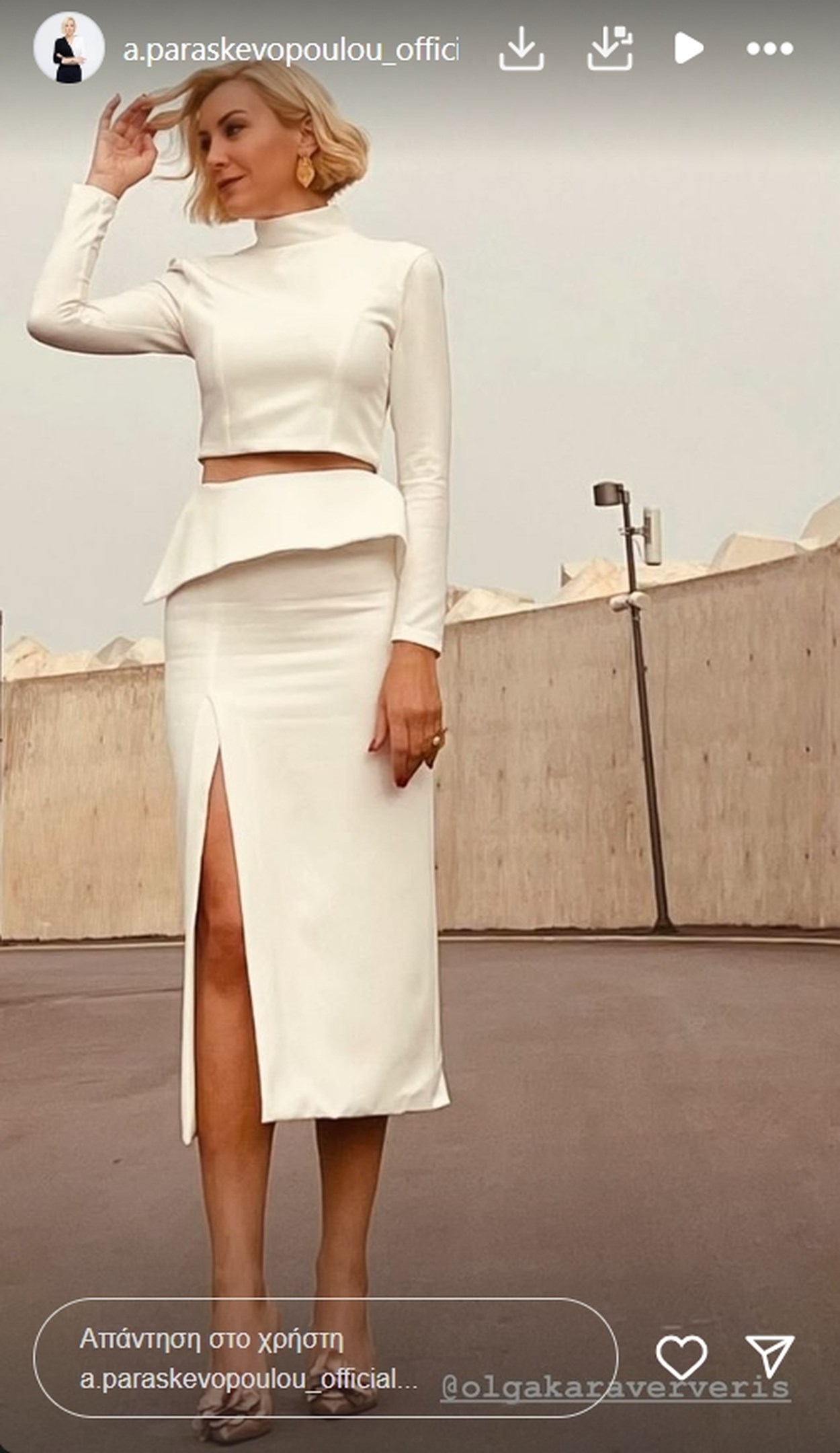 Η δημοσιογράφος και παρουσιάστρια της ΕΡΤ επέλεξε να φορέσει ένα σύνολο από δύο κομμάτια σε λευκό χρώμα, με ένα cropped μακρυμάνικο τοπ που διαθέτει ψηλό λαιμό και μία μίντι φούστα με peplum και ένα εντυπωσιακό σκίσιμο.