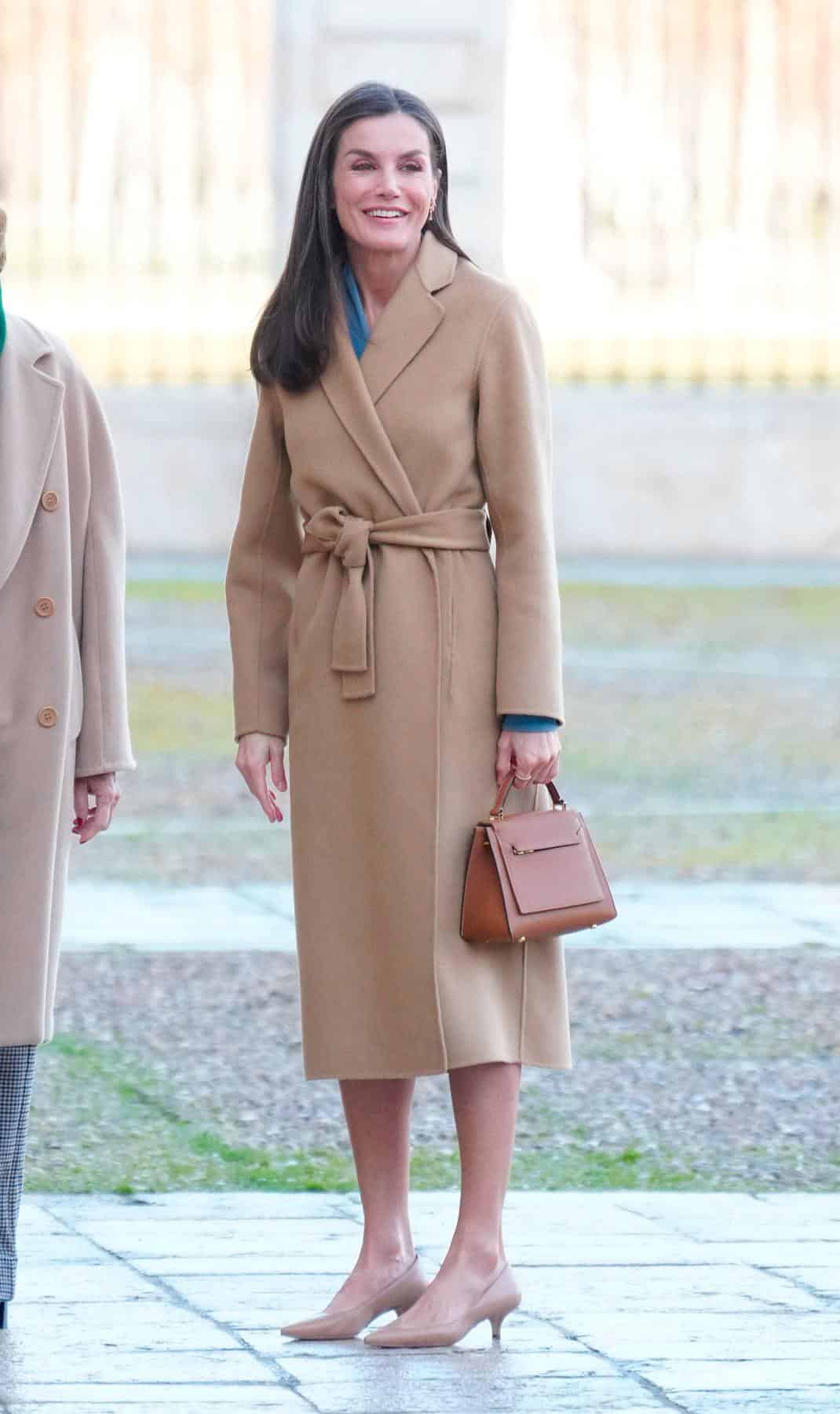Το stone παλτό με ψηλό γιακά φέρνει μινιμαλιστική κομψότητα, ενώ η μπορντό απόχρωση προσθέτει εκλεπτυσμένη ένταση, ένα χρώμα που προτιμά συχνά και η ίδια η βασίλισσα.