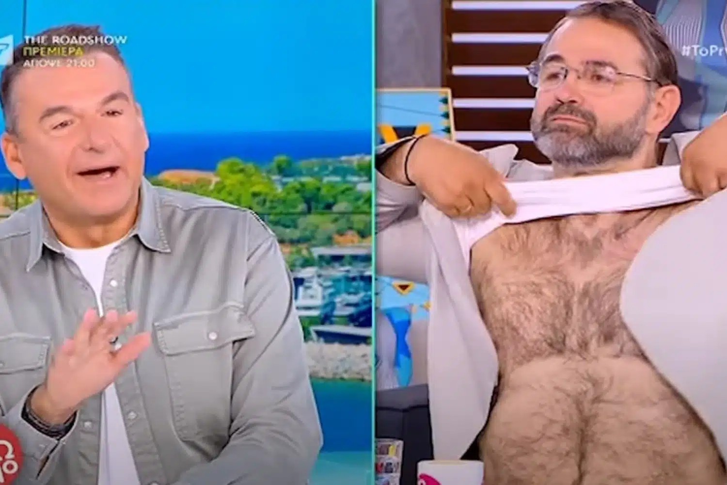 Ο Σταύρος Μπαλάσκας αιφνιδίασε το πάνελ της εκπομπής «Το Πρωινό» στον ΑΝΤ1, όταν ξαφνικά σήκωσε τη μπλούζα που φορούσε για να φανεί το στήθος του.