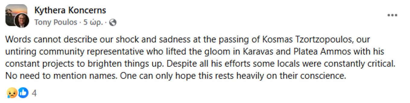 Η κοινή γνώμη στα Κύθηρα παραμένει σε σοκ για τον θάνατο του Τζωρτζόπουλου.