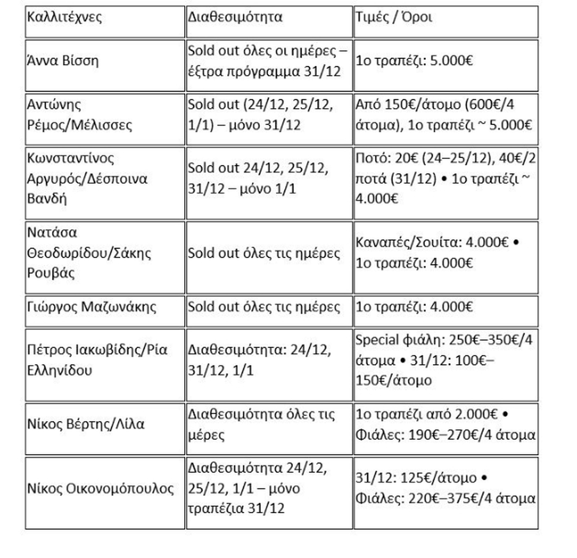 Παρόλα αυτά, σε ορισμένα σχήματα υπάρχει περιορισμένη διαθεσιμότητα, κυρίως για συγκεκριμένες ημερομηνίες ή μόνο με ποτό. Οι τιμές έχουν αυξηθεί κατακόρυφα λόγω της ζήτησης, με τα ρεβεγιόν να αποτελούν κορυφαία επιλογή για όσους θέλουν να γιορτάσουν σε κεντρικές πίστες με γνωστά σχήματα, σύμφωνα με το ρεπορτάζ της εκπομπής “Κοινωνία Ώρα MEGA”.