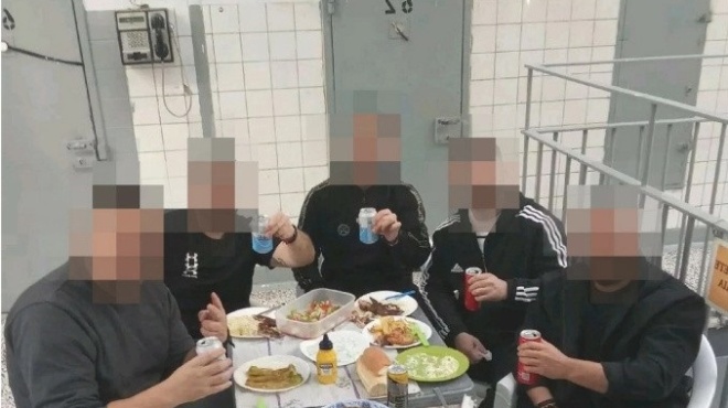 Στην εικόνα, πέντε κρατούμενοι έχουν οργανώσει ένα φαγοπότι στο κελί τους. Ένας άλλος κρατούμενος τραβάει τη φωτογραφία. Στο τραπέζι υπάρχουν τρόφιμα και ποτά, καθώς και κινητά τηλέφωνα. Το μενού περιλαμβάνει κρέας, ψητές πιπεριές, σαλάτες, τηγανητές πατάτες και τζατζίκι, μεταξύ άλλων.