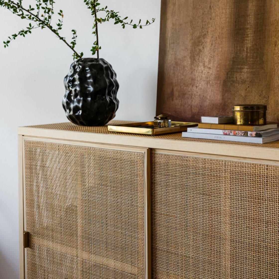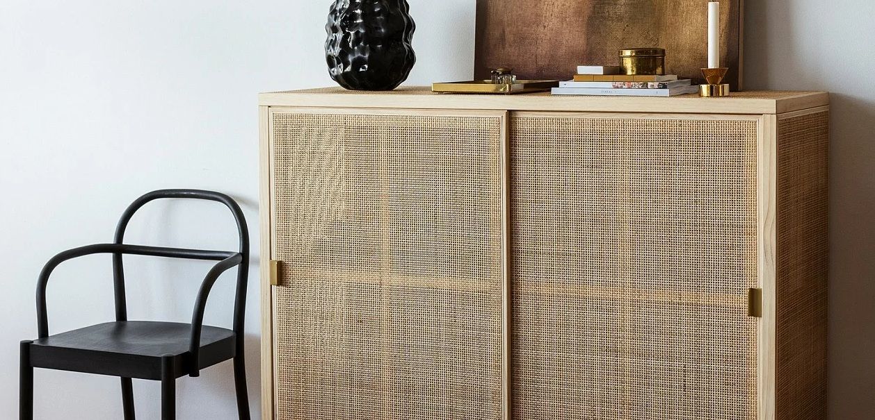 Το συγκεκριμένο έπιπλο θυμίζει περισσότερο κομψή ντουλάπα παρά κλασική παπουτσοθήκη. Κατασκευασμένη από φυσικά υλικά όπως μπαστούνι και πεύκο, με συρόμενες πόρτες από ρατάν και φινίρισμα σε φυσικό ξύλο, δίνει μια αίσθηση πολυτέλειας που ταιριάζει τόσο σε σκανδιναβικά όσο και σε μεσογειακά σπίτια. Οι λεπτομέρειες από ορείχαλκο προσθέτουν μια εκλεπτυσμένη πινελιά, μετατρέποντας την αποθήκευση σε στοιχείο διακόσμησης.