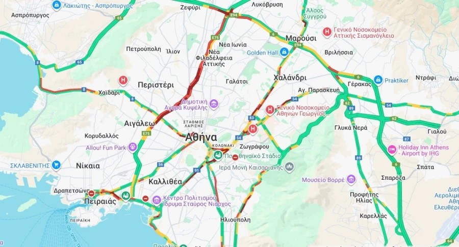 Στο κόκκινο είναι πολλοί δρόμοι της Αττικής λόγω της αυξημένης κίνησης, με τις μεγαλύτερες καθυστερήσεις να παρατηρούνται και στα δύο ρεύματα του Κηφισού.