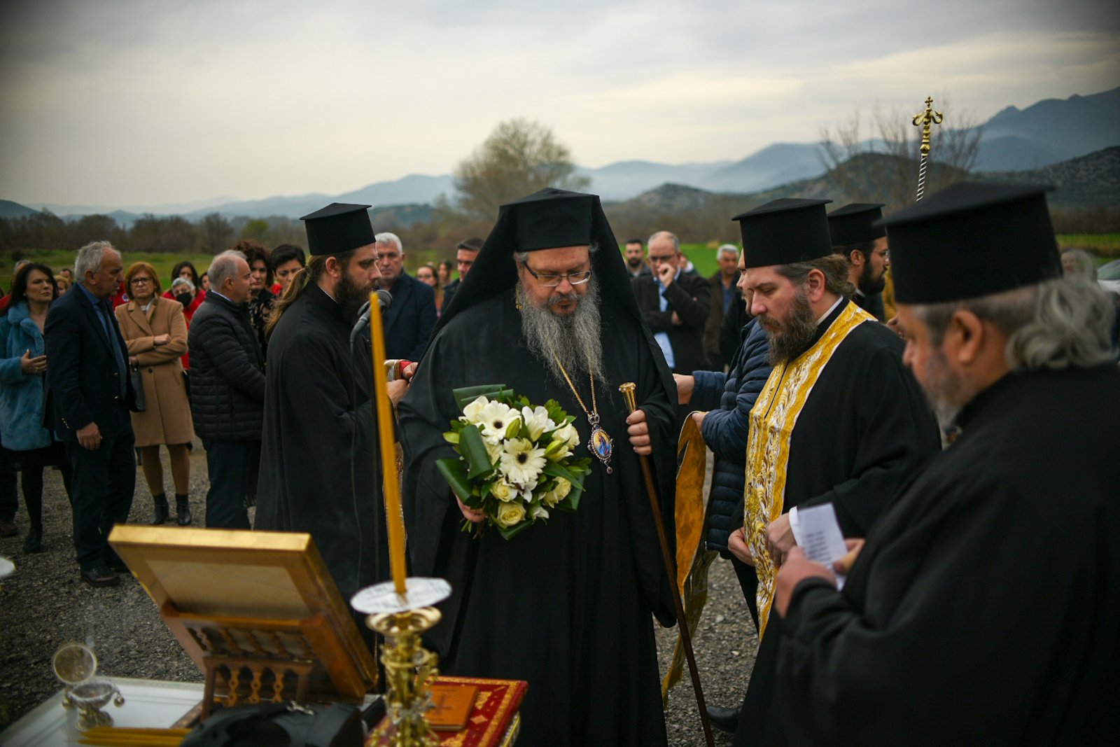 Ο Μητροπολίτης Λαρίσης και Τυρνάβου Ιερώνυμος ,διασώστες ,συγγενείς και φίλοι των θυμάτων παρευρέθηκαν ένα χρόνο μετά στο μέρος που έγινε το τραγικό σιδηροδρομικό δυστύχημα στα Τέμπη με θύματα 57 επιβάτες και εργαζομένους στην αμαξοστοιχία που συγκρούστηκε μετωπικά με εμπορική αμαξοστοιχία.