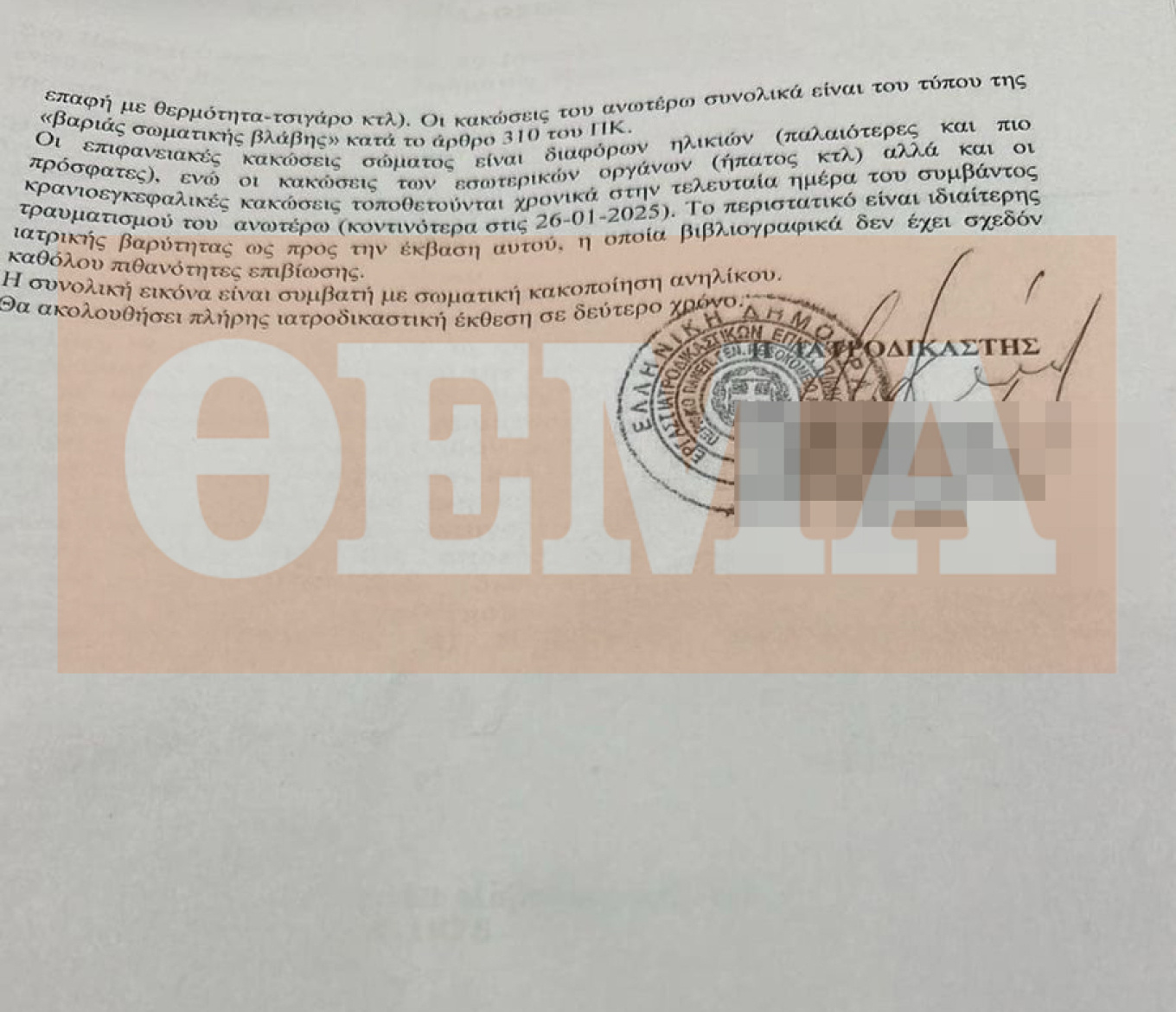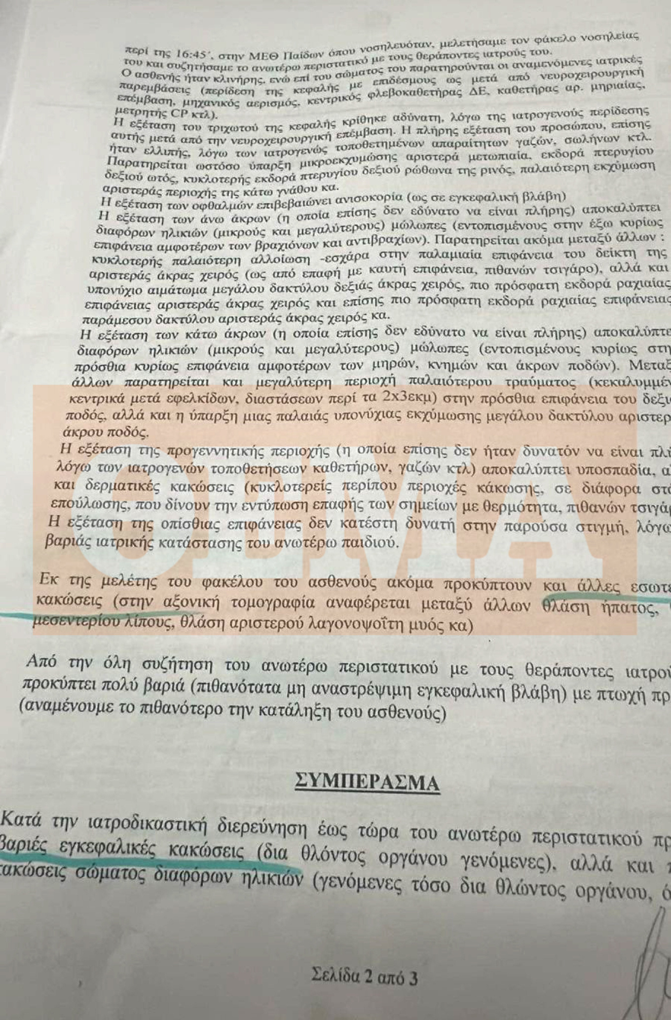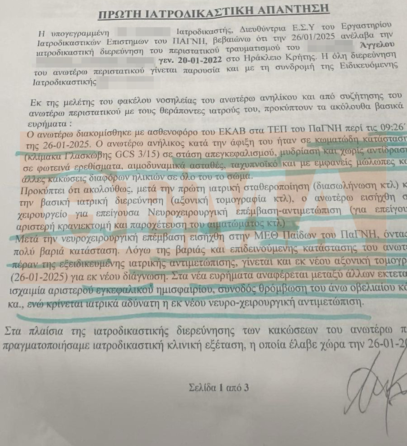 Η πρώτη ιατροδικαστική απάντηση επιβεβαιώνει την τραγική κατάσταση του παιδιού: «Το παιδί διακομίσθηκε με ασθενοφόρο του ΕΚΑΒ στα ΤΕΠ του ΠΑΓΝΗ στις 9:26 στις 26.01.2025. Ο ανωτέρω ανήλικος κατά την άφιξή του ήταν σε κωματώδη κατάσταση (κλίμακα Γλασκώβης GC 3/15) σε στάση απεγκεφαλισμού, μυδρίαση και χωρίς αντίδραση σε φωτεινά ερεθίσματα, αιμοδυναμικά ασταθές, ταχυπνοϊκό και με εμφανείς μώλωπες και άλλες κακώσεις διαφόρων ηλικιών σε όλο του το σώμα».