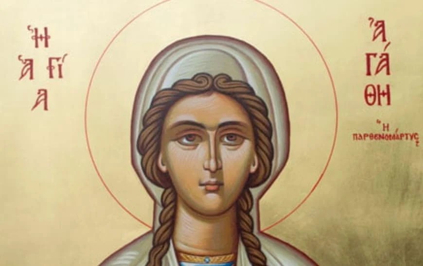 Η Αγία Αγάθη, έζησε κατά τον 3ο αιώνα, όταν αυτοκράτορας των Ρωμαίων ήταν ο Δέκιος και έπαρχος της γενέτειράς της νήσου Σικελίας, ο Κουϊντιανός. Η Αγάθη ήταν μόλις 15 ετών όταν ακούστηκε ότι ξέσπασε ο διωγμός κατά των Χριστιανών. Η μικρή κοπέλα δεν δείλιασε στο άκουσμα της είδησης. Οπλισμένη με την ακράδαντη πίστη της στον Ιησού Χριστό έσπευσε να στερεώσει στην πίστη και να νουθετήσει τους Χριστιανούς του νησιού, τονίζοντας την αξία της αιώνιας ζωής.