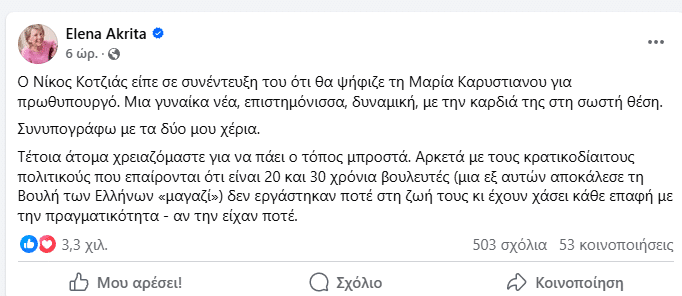 Τι έγραψε στην ανάρτησή της στην κ. Ακρίτα: