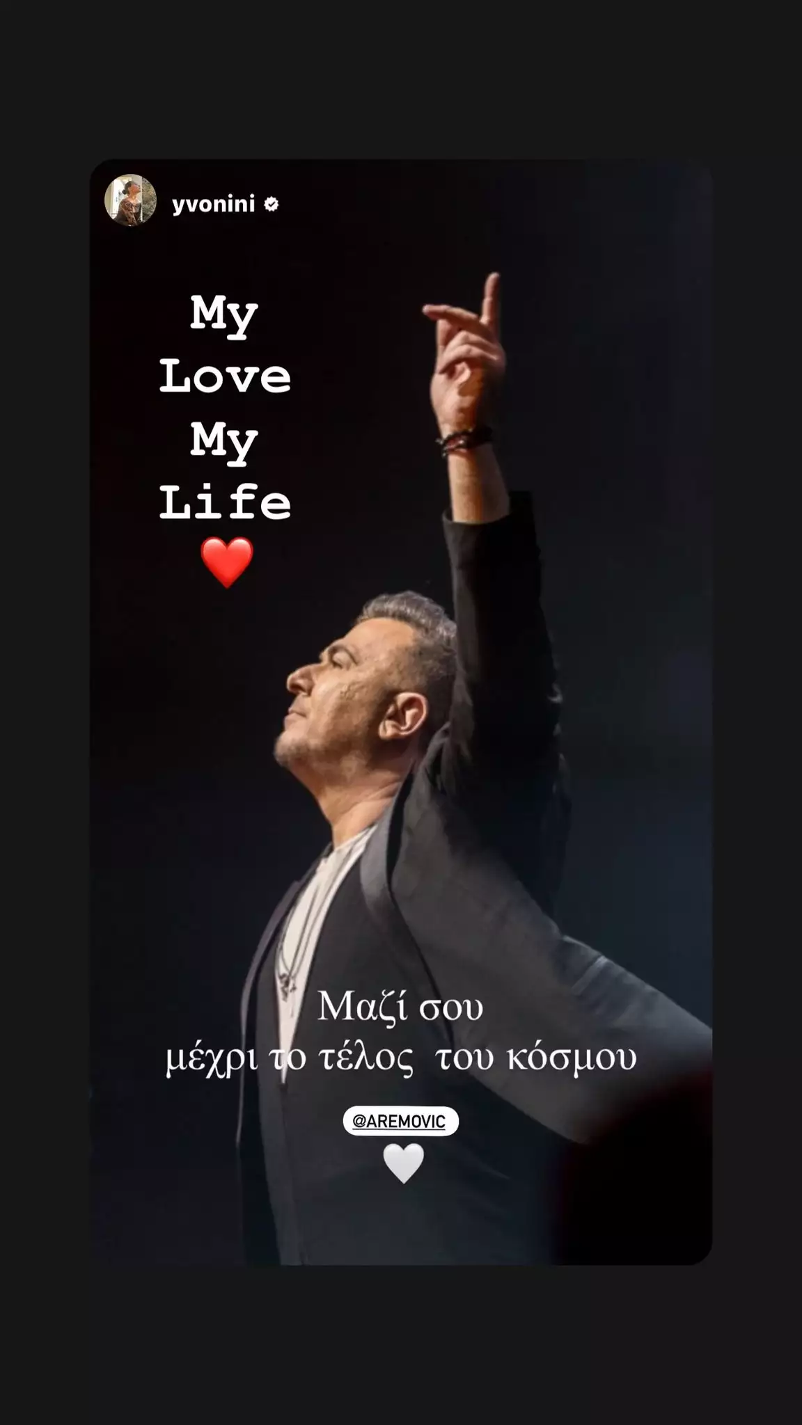 Και αυτήν τη φορά, η Υβόννη Μπόσνιακ αποφάσισε να εκφράσει την αγάπη και τη στήριξή της προς τον σύζυγό της με μια δημοσίευση φωτογραφίας στο προφίλ της στο Instagram, συνοδεύοντας τη με τα εξής λόγια: «Αγάπη μου. Ζωή μου. Μαζί σου μέχρι το τέλος του κόσμου».