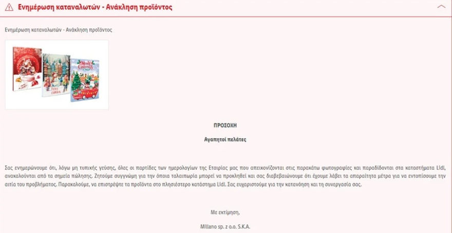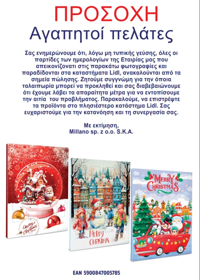 «Σας ενημερώνουμε ότι, λόγω μη τυπικής γεύσης, όλες οι παρτίδες των ημερολογίων της Εταιρίας μας που απεικονίζονται στις παρακάτω φωτογραφίες και παραδίδονται στα καταστήματα Lidl, ανακαλούνται από τα σημεία πώλησης».
