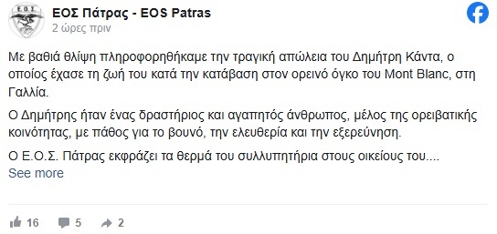 Σε ανάρτησή του, ο ΕΟΣ Πάτρας γράφει: «Με βαθιά θλίψη πληροφορηθήκαμε την τραγική απώλεια του Δημήτρη Κάντα, ο οποίος έχασε τη ζωή του κατά την κατάβαση στον ορεινό όγκο του Mont Blanc, στη Γαλλία.