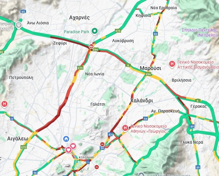 άνω των 30΄από τον κόμβο Φυλής έως τον κόμβο Κηφισίας,