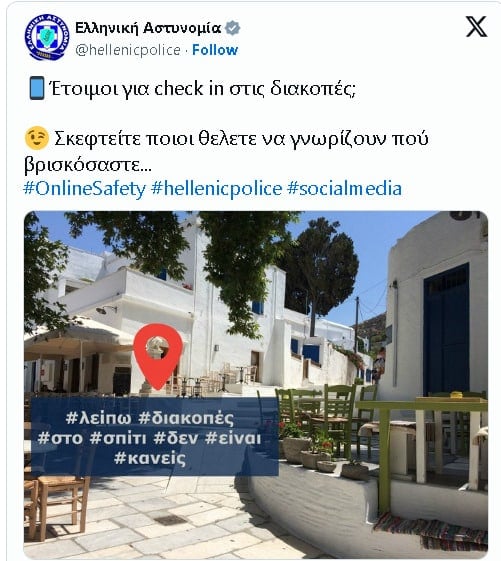 Τον κώδωνα κινδύνου κρούει η Ελληνική Αστυνομία, προειδοποιώντας, με ανάρτησή της στο Twitter, για τους κινδύνους που ελλοχεύει η συνήθειά μας να κάνουμε check in στα social media στη διάρκεια των διακοπών μας. Το tweet της ΕΛΑΣ συνοδεύεται από μια φωτογραφία που παραπέμπει σε διακοπές σε ελληνικό νησί με τα hashtag «#λείπω #διακοπές #στο #σπίτι #δεν # είναι #κανείς».