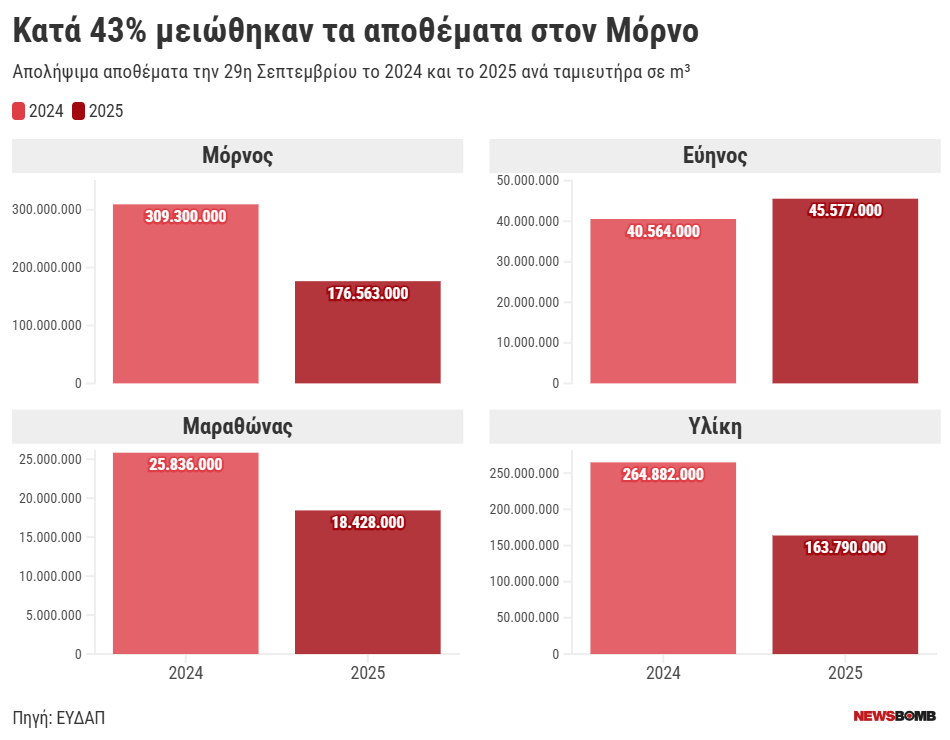 Από τους τέσσερις ταμιευτήρες, η μεγαλύτερη απώλεια νερού έλαβε χώρα στον μεγαλύτερο εξ αυτών, στον Μόρνο. Την ίδια ημέρα πέρυσι η τεχνητή λίμνη διέθετε 309 εκατ. κυβικά μέτρα νερού, ενώ φέτος τα αποθέματα σχεδόν υποδιπλασιάστηκαν σε 176 εκατ. κυβικά μέτρα.