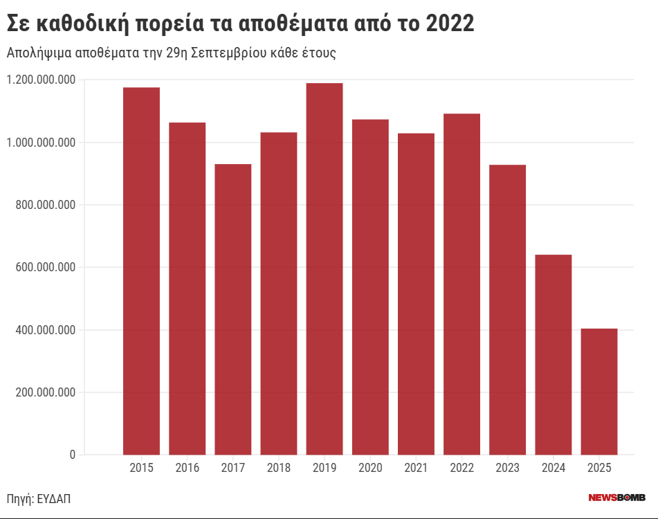 Σήμερα, επίσημη έναρξη του υδρολογικού έτους, τα συνολικά αποθέματα της ΕΥΔΑΠ είναι μειωμένα στα 403,3 εκατ. κυβικά μέτρα νερού, από 639 εκατ. κυβικά μέτρα στις 30 Σεπτεμβρίου 2024!