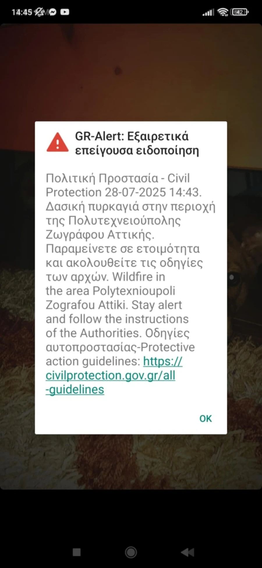 Μάλιστα λίγα λεπτά αργότερα ήχησε και το 112 για τη φωτιά καλώντας τους κατοίκους να είναι σε ετοιμότητα.
