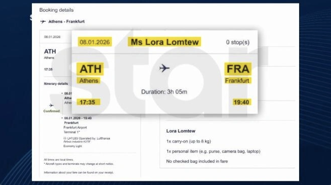 Στο επίκεντρο της έρευνας βρέθηκε από την αρχή το αεροπορικό εισιτήριο στο όνομά της. Σύμφωνα με τα στοιχεία, η πτήση αναχώρησε από το αεροδρόμιο «Ελευθέριος Βενιζέλος» στις 17:35 και προσγειώθηκε στη Φρανκφούρτη τρεις ώρες και πέντε λεπτά αργότερα. Παρά το εισιτήριο, δεν έχει ακόμη επιβεβαιωθεί επισήμως αν η Λόρα επιβιβάστηκε στο αεροπλάνο.