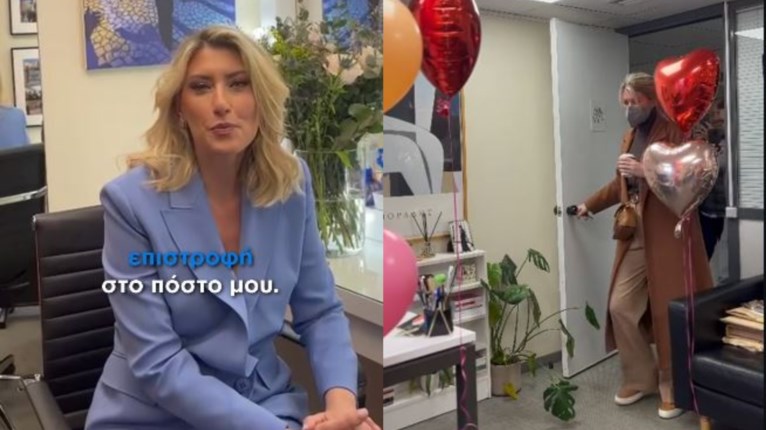 Η δημοσιογράφος επέστρεψε σήμερα Τρίτη 24/2 στο γραφείο της στον ΣΚΑΪ όπου οι συνεργάτες της της επεφύλασσαν μια έκπληξη: με λουλούδια και μπαλόνια την υποδέχτηκαν πίσω μετά από έναν μήνα απουσίας.