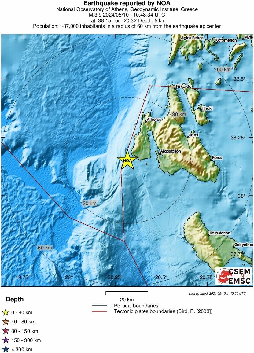 Σεισμός σημειώθηκε το μεσημέρι της Παρασκευής 10/5, ανοιχτά της Κεφαλονιάς. Ο σεισμός ήταν 3.9 Ρίχτερ της κλίμακας Ρίχτερ.