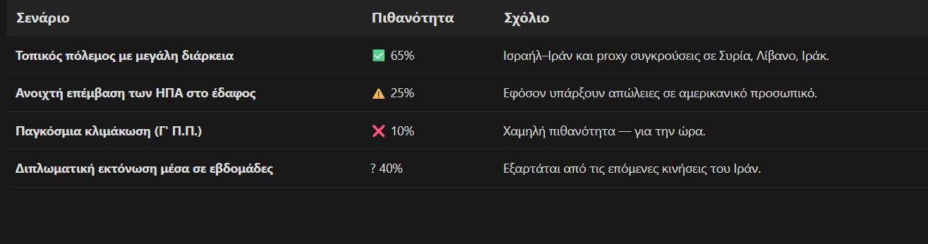 «Ο κίνδυνος ευρύτερης κλιμάκωσης παραμένει υψηλός, ειδικά αν το Ιράν χτυπήσει αμερικανικές βάσεις στον Περσικό Κόλπο, ή αν εμπλακούν συμμαχικές δυνάμεις του ΝΑΤΟ. Όμως, υπάρχει ακόμη “παράθυρο” για διπλωματική αποκλιμάκωση.»