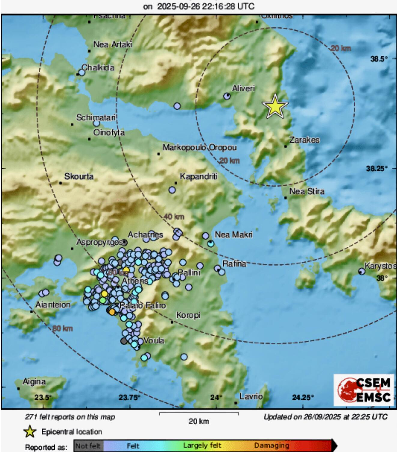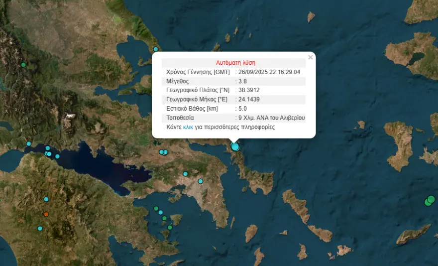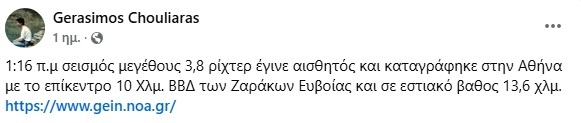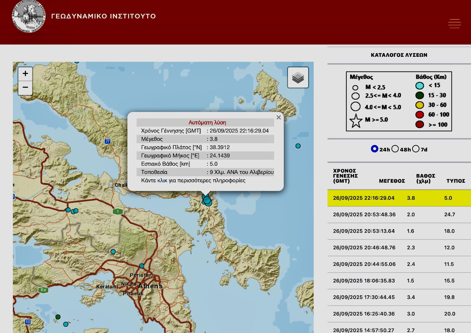 «1:16 π.μ. σεισμός μεγέθους 3,8 Ρίχτερ έγινε αισθητός και καταγράφηκε στην Αθήνα με επίκεντρο το Αλιβέρι και σε εστιακό βάθος 13,6 χλμ».