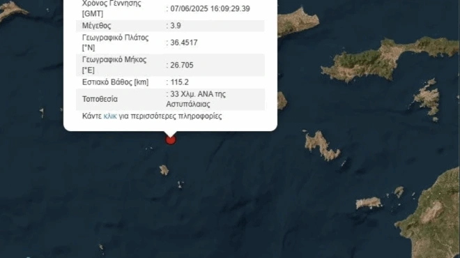 Σεισμική δόνηση μεγέθους 3,9 βαθμών της κλίμακας Ρίχτερ σημειώθηκε το απόγευμα του Σαββάτου, ανοιχτά της Αστυπάλαιας.