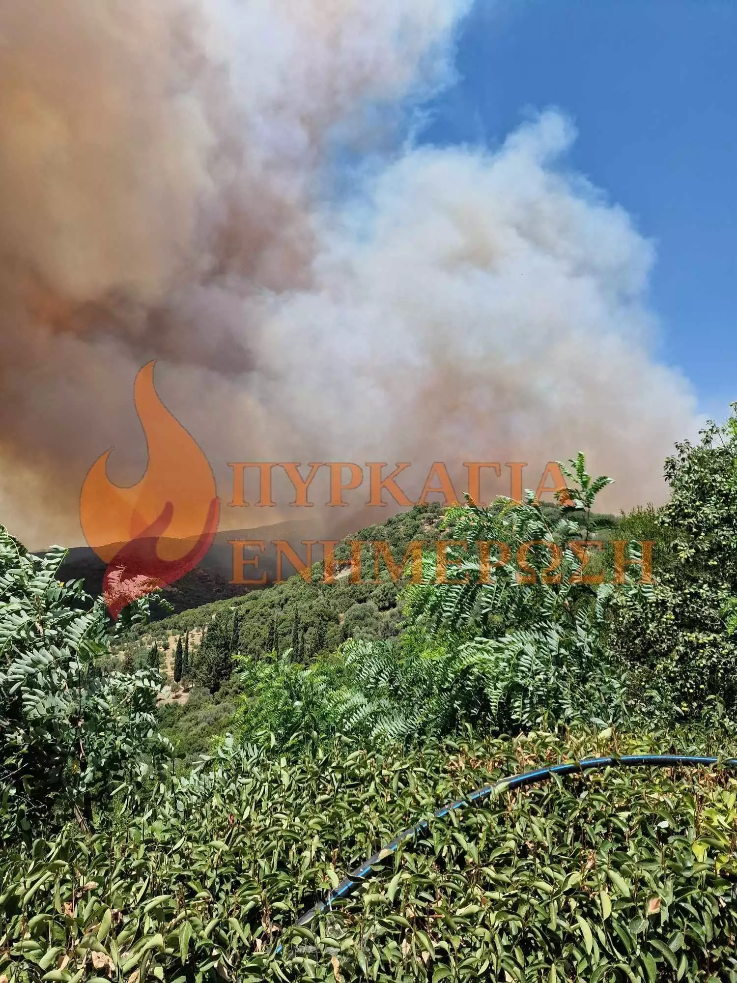 Η φωτιά πλησιάζει επικίνδυνα τις κατοικίες, ενώ στην περιοχή επιχειρούν 26 πυροσβέστες με δύο ομάδες πεζοπόρων τμημάτων, 11 οχήματα και τέσσερα ελικόπτερα.