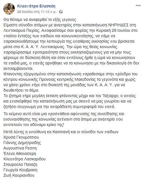 Σε κείμενο που ανάρτησε στο Facebook μία από τις συνοδούς των παιδιών ΑμΕΑ, η κα Κλεοπάτρα Ελεσκέη κατήγγειλε τα εξής: