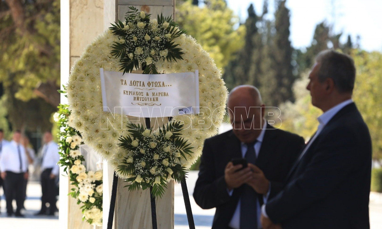 Ανάμεσα στα υπόλοιπα, ξεχωρίζει το στεφάνι του πρωθυπουργού. Ο Κυριάκος Μητσοτάκης μαζί με τη σύζυγό του Μαρέβα, συμμετέχουν στον πόνο της οικογένειας με μια απλή φράση: Τα λόγια είναι φτωχά…