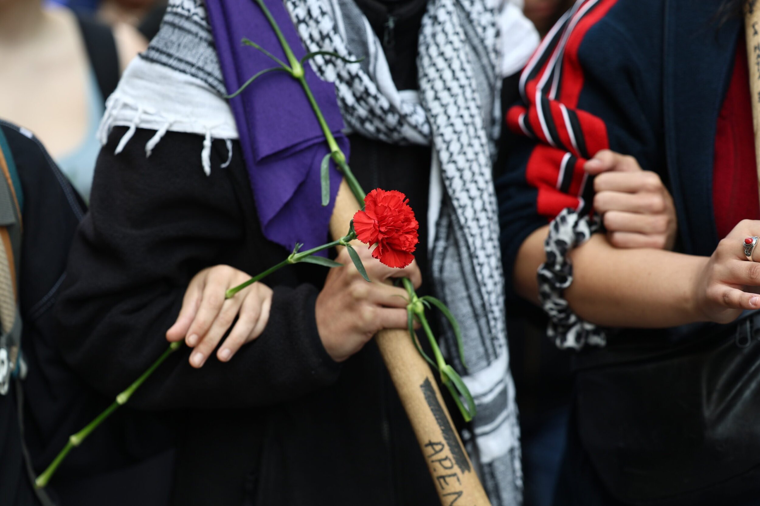 Το μπλοκ της σημαίας έκανε μια σύντομη στάση στο Μνημείο του Αγνωστου Στρατιώτη και συνέχισε την πορεία του προς την πρεσβεία των ΗΠΑ.