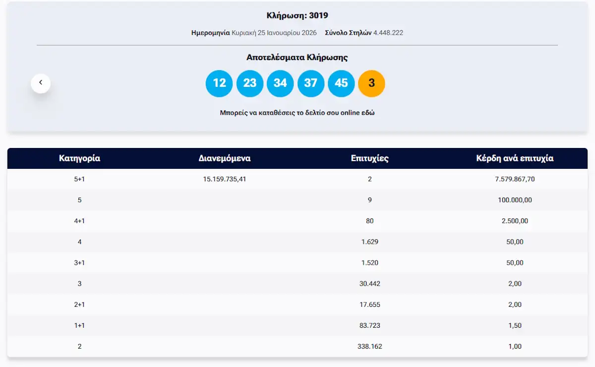 Κλήρωση Τζόκερ σήμερα 25/01/2026 και τα λεφτά ήταν… πολλά! Στην κλήρωση Τζόκερ Allwyn, σήμερα Κυριακή (αριθμός κλήρωσης 3019), οι τυχεροί αριθμοί ήταν οι: 23, 45, 12, 37, 34 και Τζόκερ ο αριθμός 3.