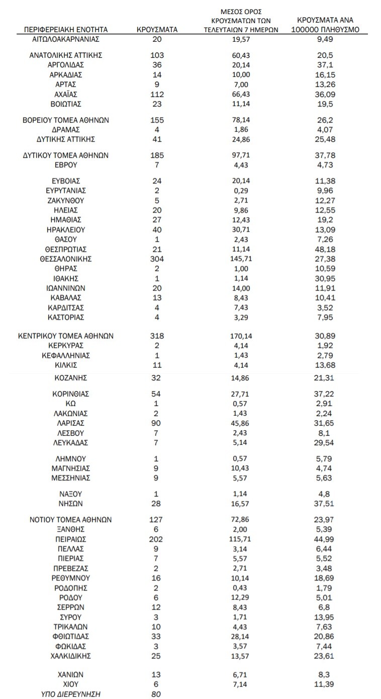 Με βάση τα επιβεβαιωμένα κρούσματα των τελευταίων 7 ημερών, 60 θεωρούνται σχετιζόμενα με ταξίδι από το εξωτερικό και 2.368 είναι σχετιζόμενα με ήδη γνωστό κρούσμα.