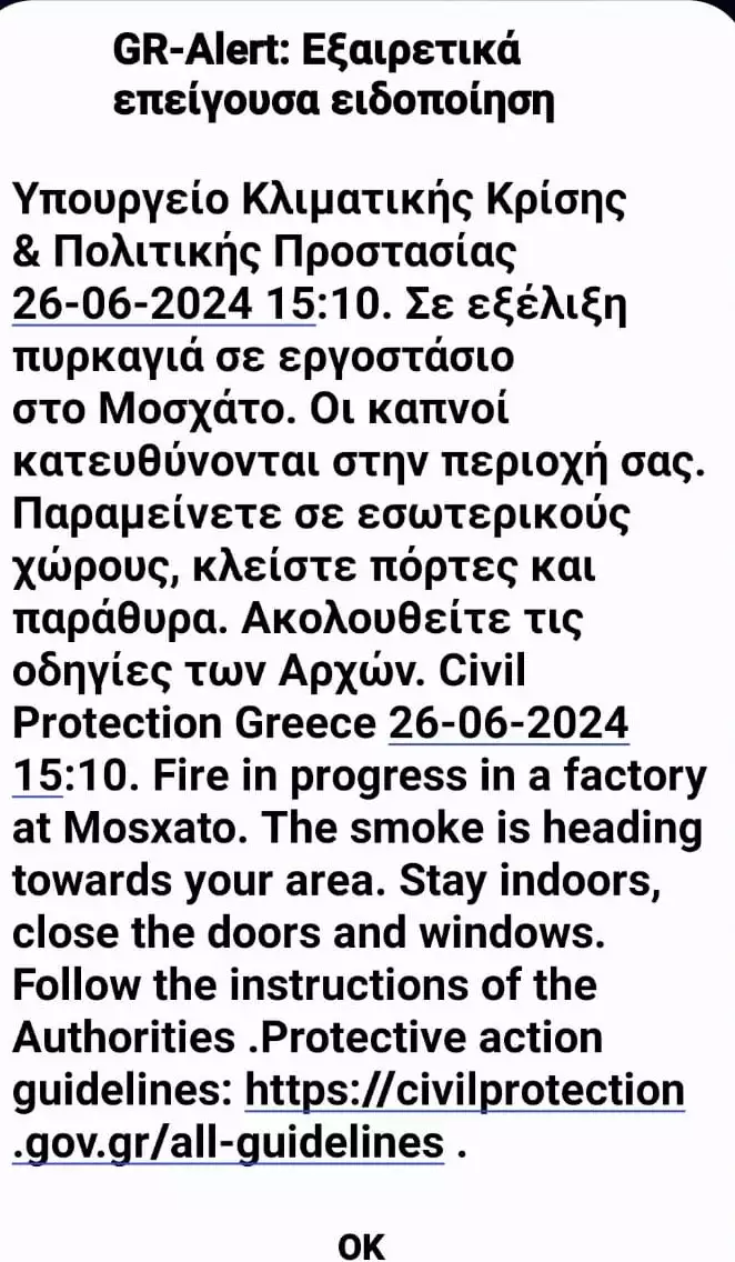 Μάλιστα, λίγο μετά τις 3 το απόγευμα εστάλη και μήνυμα από το 112 στις γύρες περιοχές, που αναφέρει χαρακτηριστικά: «Καπνοί κατευθύνονται προς την περιοχή σας, κλείστε πόρτες και παράθυρα».