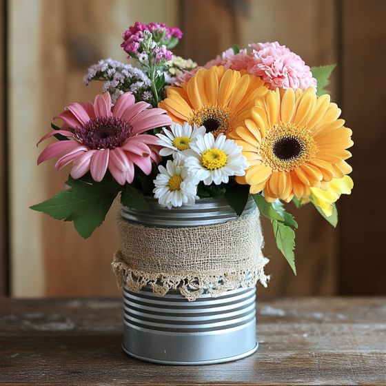 Δημιουργήστε ένα μοναδικό βάζο για τις ανθοσυνθέσεις σας χρησιμοποιώντας ένα μεταλλικό κουτί. Καθαρίστε το δοχείο και αφαιρέστε τυχόν αιχμηρές άκρες. Τυλίξτε το κουτί με λινάτσα ή δαντέλα για μια ρουστίκ εμφάνιση ή βάψτε το για ένα πιο μοντέρνο στυλ. Γεμίστε το δοχείο με νερό και βάλτε μέσα φρέσκα λουλούδια. Αυτό το βάζο προσθέτει μια προσωπική πινελιά στη διακόσμηση του σπιτιού σας και αναδεικνύει τη δημιουργικότητά σας.