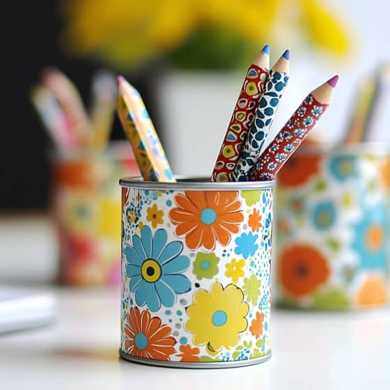 Οργανώστε το γραφείο σας με μια κομψή μολυβοθήκη φτιαγμένη από τενεκεδένιο κουτί. Αφού καθαρίσετε το δοχείο, τυλίξτε το σε διακοσμητικό χαρτί ή ύφασμα, στερεώνοντάς το με κόλλα. Μπορείτε επίσης να βάψετε το κουτί σε ένα χρώμα που ταιριάζει με τη διακόσμηση του γραφείου σας. Αυτό το απλό έργο όχι μόνο διατηρεί το γραφείο σας τακτοποιημένο, αλλά προσθέτει και μια προσωπική πινελιά στον χώρο εργασίας σας.
