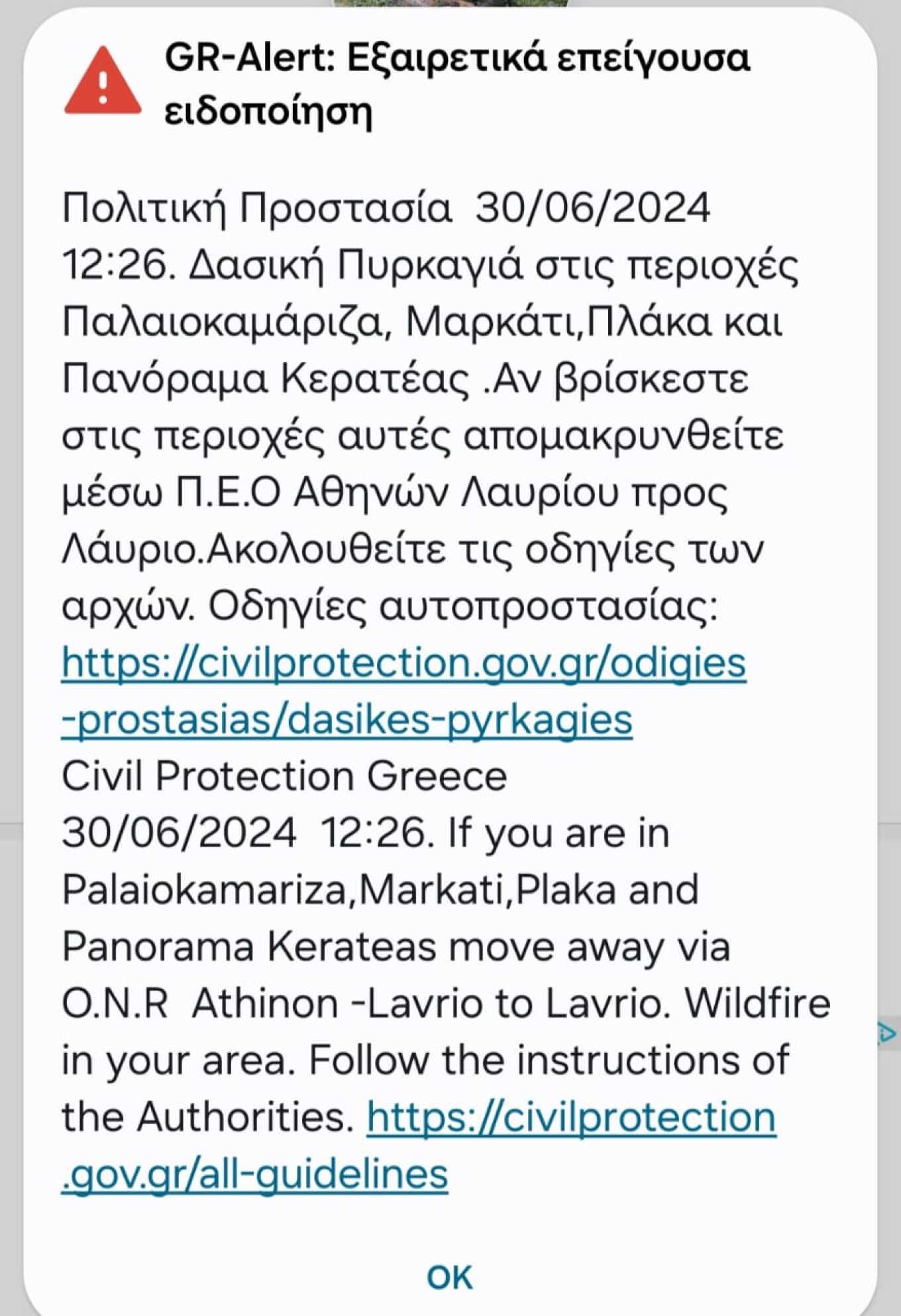 Η αρχή κινητοποίησης έκτακτης ανάγκης με αριθμό 112 εξέδωσε ειδοποίηση προς τους κατοίκους των περιοχών Παλαιοκαμάριζα, Μαρκάτι, Πλάκα και Πανόραμα Κερατέας να εκκενώσουν τις περιοχές τους και να μετακινηθούν προς την κατεύθυνση του Λαυρίου μέσω της Παλαιάς Εθνικής Οδού Αθηνών-Λαυρίου.