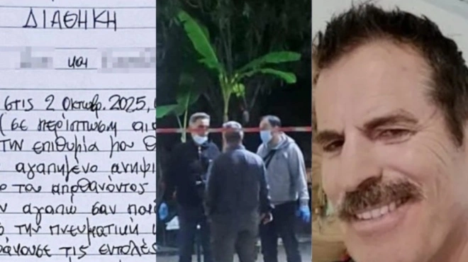Οι Αρχές έχουν στα χέρια τους και μια παλαιότερη διαθήκη του 68χρονου, συνταγμένη περίπου έναν χρόνο πριν. Η σύγκριση των δύο εγγράφων θεωρείται κρίσιμη, καθώς μπορεί να ρίξει φως στα κίνητρα του διπλού φονικού.