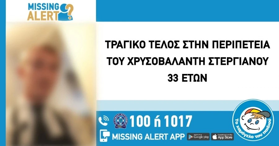 Τραγικός ήταν ο επίλογος που γράφτηκε στην υπόθεση εξαφάνισης του 33χρονου Χρυσοβαλάντη Στεργιανού.