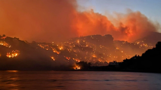 Αυτή τη στιγμή η φωτιά καίει ανεξέλεγκτα, με τους καπνούς να έχουν σκεπάσει την περιοχή και την παραλία κοντά στον Μακρύ Γυαλό. Από την πυρκαγιά έχουν καεί σπίτια, ενώ απειλούνται και ξενοδοχεία.