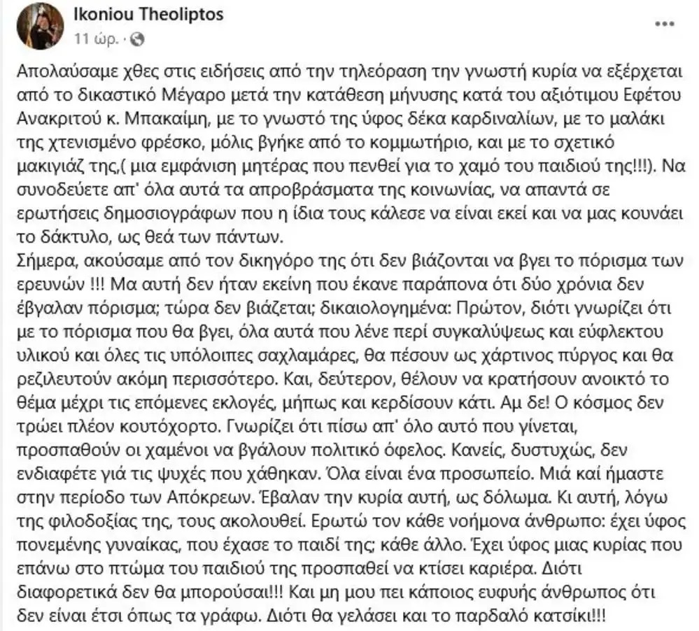 H παραπάνω αναφορά ήρθε ως απάντηση στην ανάρτηση του Μητροπολίτη Ικονίου στο Facebook, ο οποίος είχε γράψει:«Απολαύσαμε χθες στις ειδήσεις από την τηλεόραση τη γνωστή κυρία να εξέρχεται από το δικαστικό Μέγαρο μετά την κατάθεση μήνυσης κατά του αξιότιμου Εφέτου Ανακριτού κ. Μπακαίμη, με το γνωστό της ύφος δέκα καρδιναλίων, με το μαλλάκι της χτενισμένο φρέσκο, μόλις βγήκε από το κομμωτήριο, και με το σχετικό μακιγιάζ της (μια εμφάνιση μητέρας που πενθεί για το χαμό του παιδιού της!!!).