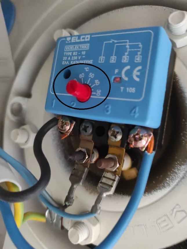 Αφού κλείσετε την παροχή ηλεκτρικού ρεύματος προς το θερμοσίφωνα, χρησιμοποιώντας ένα κατσαβίδι μπορείτε να στρίψετε τη ροδέλα αυτή δεξιόστροφα ή αριστερόστροφα και να επιλέξετε τη θερμοκρασία που επιθυμείτε.