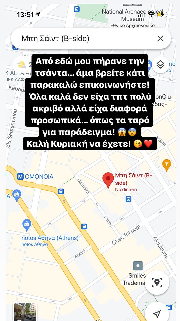 Ο ίδιος απηύθυνε δημόσια έκκληση μέσα από τον προσωπικό του λογαριασμό στο Instagram να βρεθεί η τσάντα του. Όπως χαρακτηριστικά έγραψε «Παιδάκια sos! Μου κλέψανε αυτό το backpack πριν λίγο… σας παρακαλώ άμα τη δείτε επικοινωνήστε μαζί μου. Έχει ένα ροζ αρκουδάκι της αγάπης στο φερμουάρ».