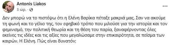 Την δυσάρεστη είδηση έκανε γνωστή, ο καθηγητής Αντώνης Λιάκος, ο οποίος έγραψε σε ανάρτησή του: “Δεν μπορώ να το πιστέψω ότι η Ελένη Βαρίκα πέταξε μακριά μας. Σαν να ακούμε τη φωνή και το γέλιο της, τον εφηβικό τρόπο που μιλούσε για την ιστορία και τον φεμινισμό, την πολιτική θεωρία και τη θέση του παρία, ξαναφέρνοντας όλες εκείνες τις ιδέες και τις αξίες που μεγαλώσαμε στην επικαιρότητα, σε πείσμα των καιρών. Η Ελένη. Πώς είναι δυνατόν;”.