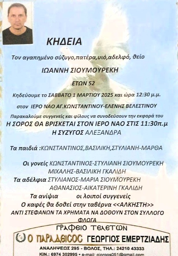 Βαρύ πένθος έχει προκαλέσει στη Μαγνησία, τον Βόλο και το Βελεστίνο η είδηση του θανάτου του Γιάννη Σιουμουρέκη. Ο 52χρονος έφυγε από τη ζωή, βυθίζοντας στο πένθος την οικογένειά του, συγγενείς και φίλους.