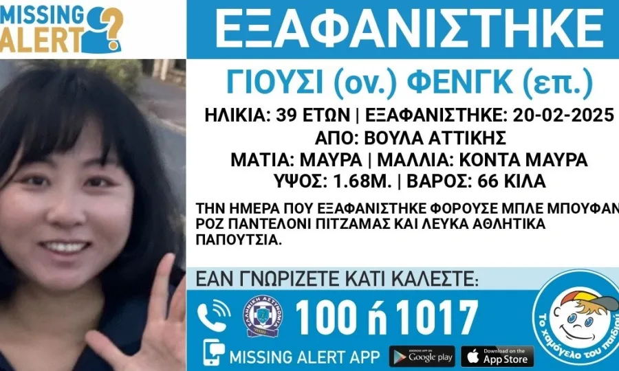 Η 39χρονη, ασιατικής καταγωγής, εξαφανίστηκε το βράδυ της Πέμπτης στην περιοχή της Βούλας, με τις αρχές να εκδίδουν Missing Alert την Παρασκευή 21 Φεβρουαρίου, σε μια προσπάθεια να συγκεντρώσουν πληροφορίες που θα βοηθούσαν στον εντοπισμό της. Ωστόσο, η αναζήτησή της έληξε με τον πιο δυσάρεστο τρόπο, όταν μέλη της Πολιτικής Προστασίας εντόπισαν τη σορό της το πρωί του Σαββάτου, σε απομονωμένη σπηλιά κοντά στο κοιμητήριο της Βούλας.